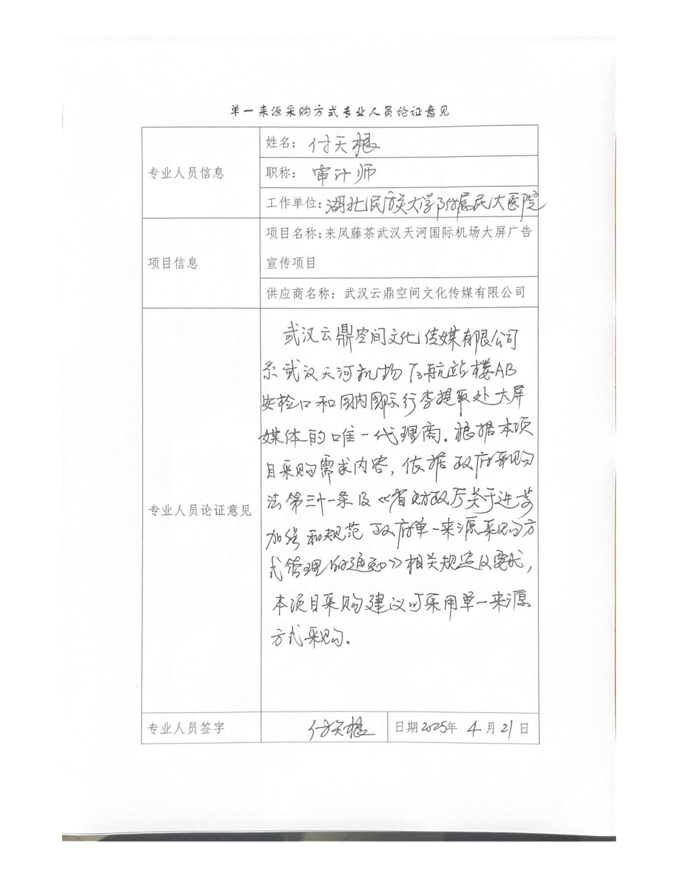 武汉云鼎空间文化传媒有限公司为武汉天河国际机场T3航站楼AB安检口上方的大屏媒体和国内国际到达行李提取转盘上方的矩阵式LED大屏媒体的独家代理,故本项目只能从唯一供应商处采购。符合《中华人民共和国政府采购法》第三十一条第一款规定,以及《省财政厅关于进一步加强和规范政府采购单一来源采购方式管理的通知》(鄂财采规[2020]1号文件)要求,拟采用单一来源方式采购。